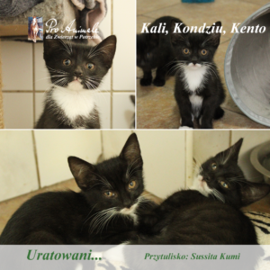 Przed bramą naszego azylu znaleziono pudełko, w którym ktoś pozostawił trzy kocięta: Kali, Kento i Kodziu. Zwierzęta były pozbawione jakiejkolwiek opieki, narażone na wychłodzenie, głód oraz zagrożenia wynikające z pozostawienia ich w miejscu publicznym. Odkrycie ich w takim stanie wymagało natychmiastowej reakcji.