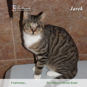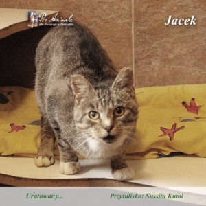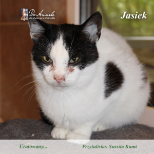 Sześciomiesięczny kocur Jasiek został znaleziony osierocony na działkach w Drzonowie.